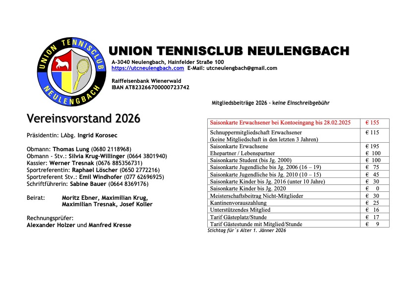 Mit Bezahlung des Gesamtbetrages auf unser Konto bei der Raiffeisenbank Wienerwald: IBAN AT82 3266 7000 0072 3742 werden Sie als ordentliches Mitglied angeführt.
